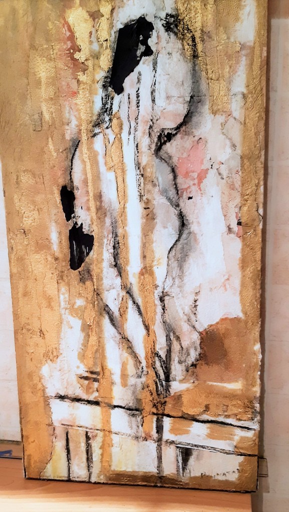Ogni opera, grande o piccola che sia, vede un lavoro certosino dell’artista che inizia con una una ricerca colta e raffinata del materiale e delle sue sfumature, lavorate sapientemente con audacia ma anche equilibrio ed armonia, trasferendo sulla tela l’immateriale, come il tempo e lo spazio, attraverso il linguaggio da lei creato e diventato il suo personalissimo codice di comunicazione. Questo insieme di opere sembra essere la mappa per un viaggio attraverso nuovi orizzonti nel mondo di Adriana, e anche in noi stessi, come una metafora di un invito ad esplorare oltre la forma, la materia e il pensiero dell’artista, attribuendo a forme e colori il nostro personale significato.
